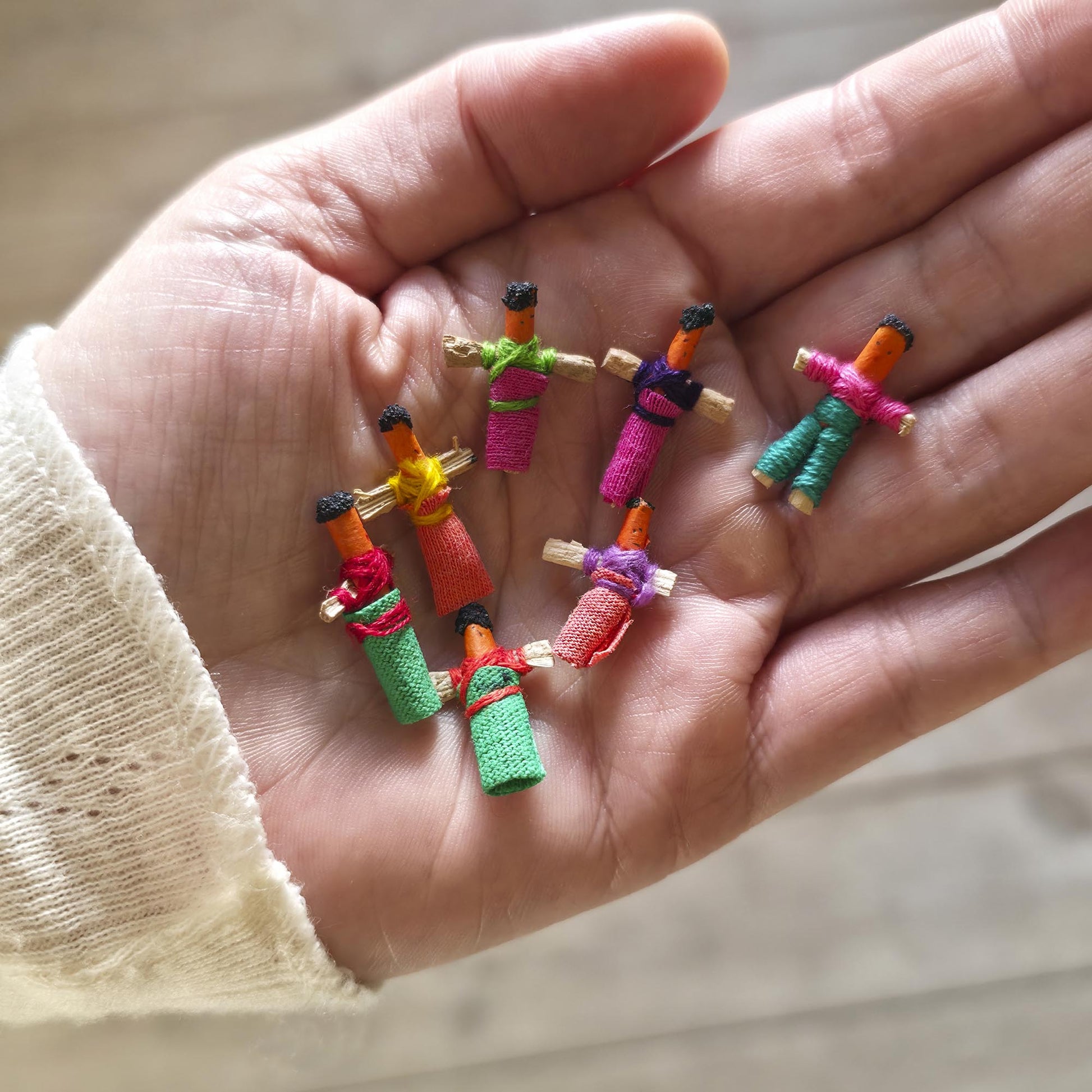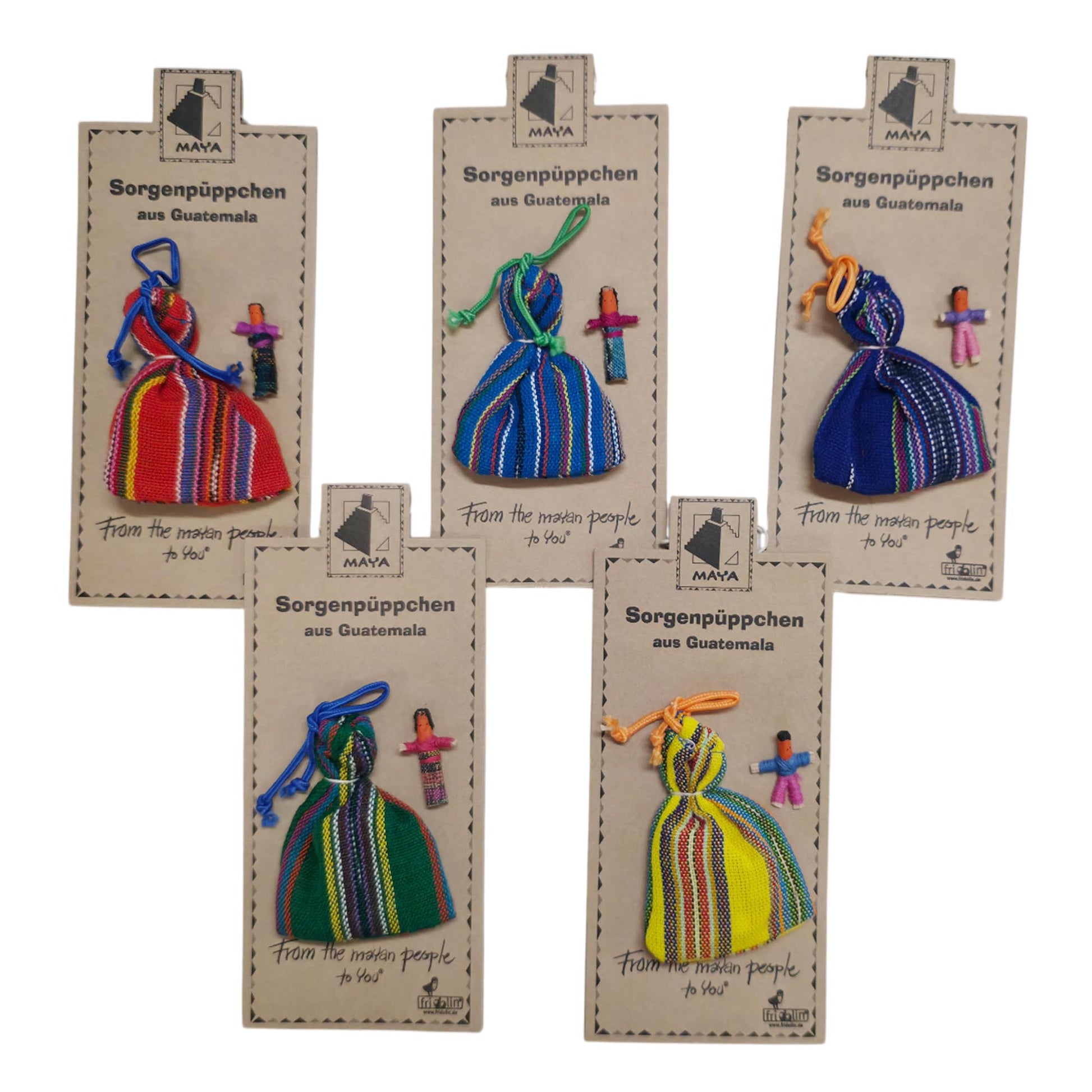 Bekymringsdukke assorteret 1 stk er en lille og særlig dukke med en smuk historie bag sig. Dukkerne er fremstillet af mayaindianerne i det guatemalanske højland og er inspireret af en gammel tradition. Ifølge legenden fortæller børn deres bekymringer til dukkerne inden sengetid. Dukkerne lægges derefter under hovedpuden, og næste morgen har de taget bekymringerne med sig, så barnet kan vågne med ro i maven.