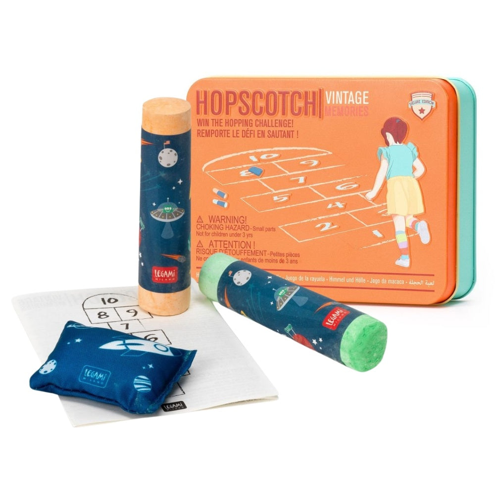 Legami hinkeleg er et klassisk udendørsspil, hvor børn kan tegne hinkeruder og hoppe fra felt til felt. Sættet indeholder en sandpose og to farvede kridt, så legen hurtigt kan sættes i gang på asfalt eller fliser. Det hele leveres i en praktisk metalæske, som gør spillet nemt at tage med på tur eller opbevare derhjemme.
