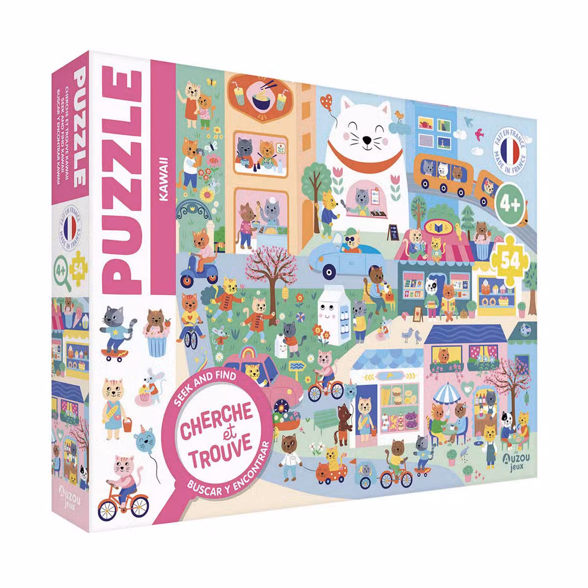 Auzou puslespil søg og find kawaii er et charmerende og farvestrålende puslespil, hvor legen ikke slutter, når brikkerne er lagt. For når det søde motiv med små katte og en livlig byscene er samlet, begynder den næste del af legen: at finde de skjulte detaljer, der gemmer sig i billedet.