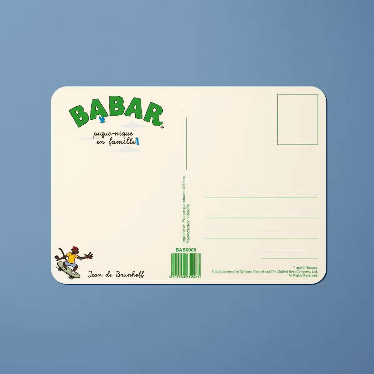 Babar Postkort Familiepicnic det perfekte lille kort til at fuldende en gave med et personligt og sødt touch. Der er noget særligt hyggeligt ved at lægge et kort ved gaven, en lille hilsen der gør det hele lidt mere varmt og nærværende. Det her kort passer perfekt til både fødselsdage, dåb, små overraskelser eller bare når man vil glæde nogen.