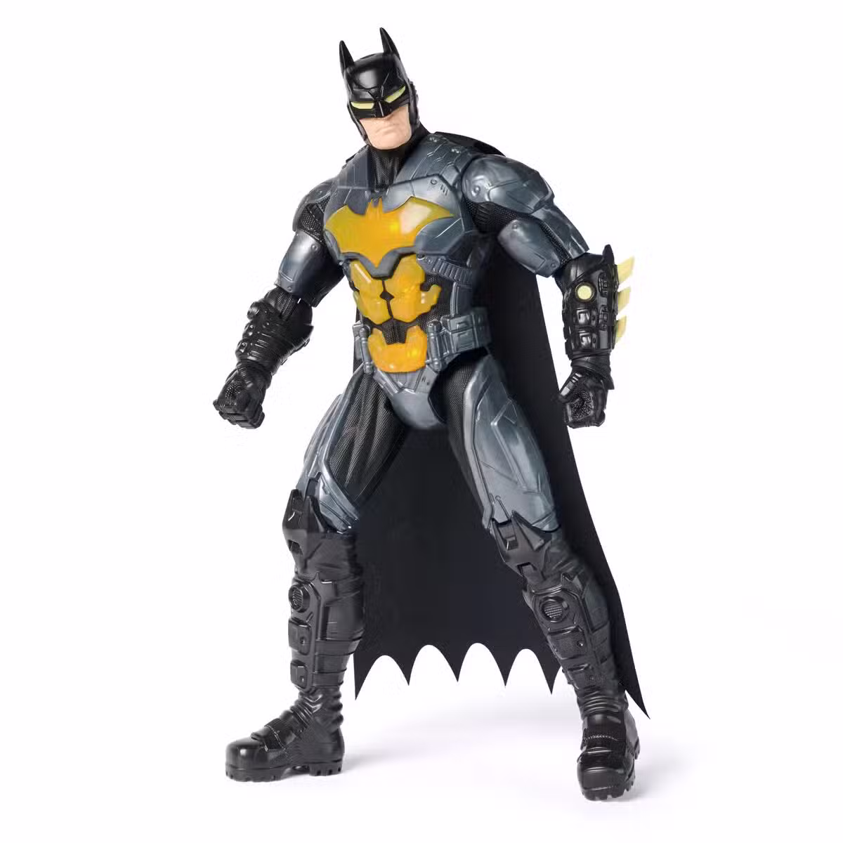 Batman Figur 30 Cm Stealth reagerer med lyd og effekter, når du aktiverer ham. Han taler, giver kommandoer og lyder, som om han er midt i en mission. Det gør legen spændende og interaktiv, og børnene kan nemt forestille sig episke kampe mod Jokeren og alle de andre skurke. Armen og benene kan bevæges, så Batman kan sættes i kampstillinger og ud på mission i hele huset.