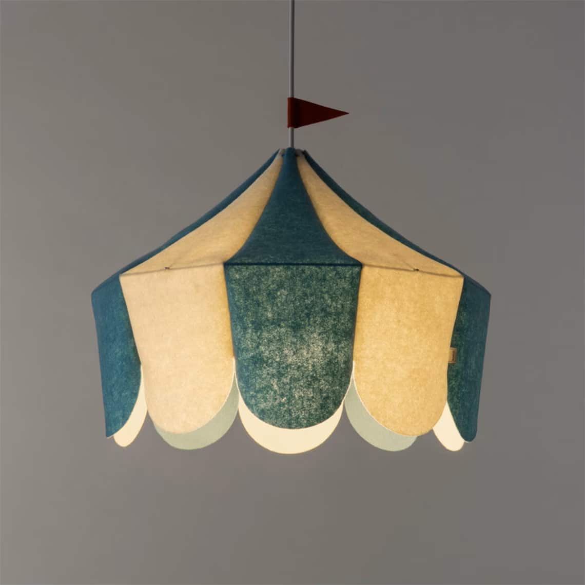 Denne fine Buokids Cirkus Loftlampe Blå/Hvid er inspireret af cirkusset, og den er lavet af uldfilt. Denne cirkuslampe er håndlavet af meget dygtige spanske håndværkere, der arbejder med de fineste materialer på en detaljerig og omhyggelig måde.