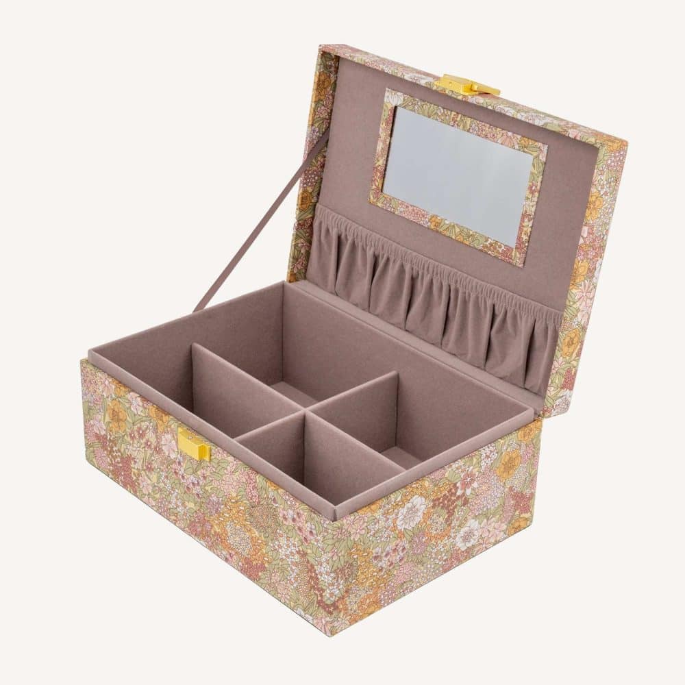 Indvendigt gemmer Bon Dep Smykkeskrin Liberty Ciara Green på to velorganiserede lag, der giver masser af plads til alt fra ringe og øreringe til armbånd og halskæder. Det øverste lag har flere små rum og en række til ringe, mens det nederste lag består af fire større rum til lidt større smykker eller andre småting. Låget er foret med blød velour og udstyret med et spejl og en elastisk lomme, som er ideel til opbevaring af smykkeposer, charms eller små noter.