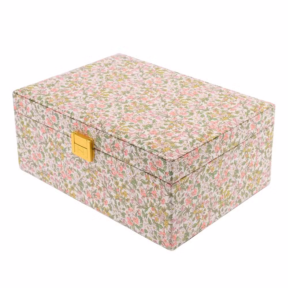 Bon Dep smykkeskrin liberty nazanin er noget helt særligt. Det er et smykkeskrin, der kombinerer romantisk Liberty design med gennemtænkt funktionalitet. Stoffet på ydersiden er det smukke “Nazanin” print fra Liberty, fyldt med små blomster i rosa, grønne og gule nuancer. Det er en skøn blanding af klassisk britisk mønsterkunst og moderne dansk designæstetik. Perfekt til børn (og voksne), der elsker smykker og små skatte, og som vil opbevare dem på fineste vis.