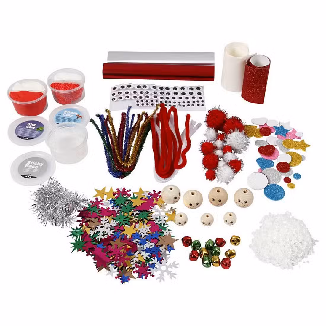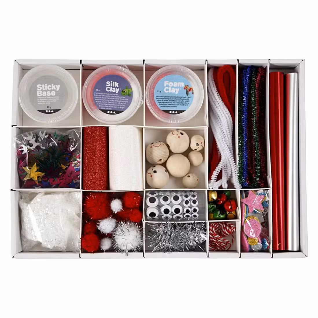 Indhold: Silk Clay, Foam Clay, Sticky Base, selvklæbende rulleøjne i ass. str., chenille i ass. farve, metal chenille, bjælder i ass. farve, metal papir, snor i bomuld, metal lametta, mosgummi cirkler med glitter, perler med ansigter i ass. str., glitter papir, pomponer i ass. farve og str., kunstig sne og palietter i ass. farve og str.