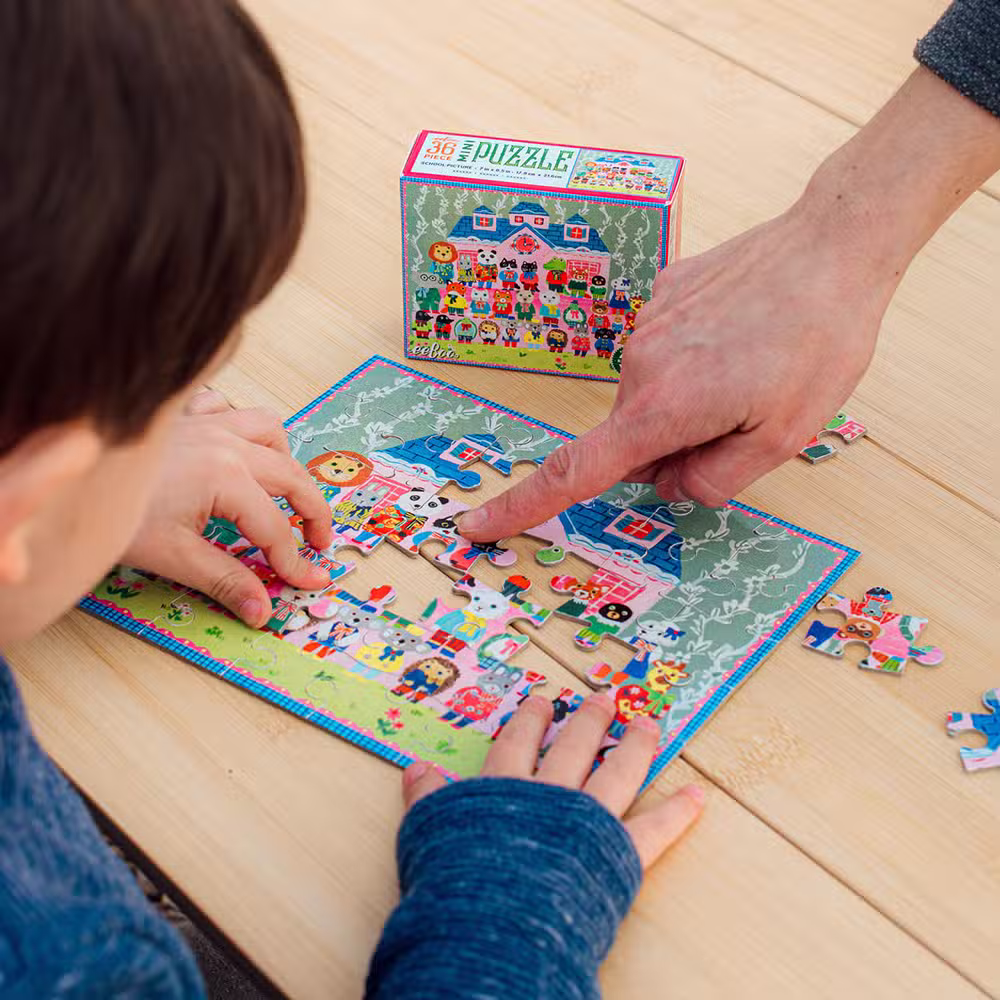 Eeboo puslespil mini 36 brikker assorteret er små puslespil som er perfekt til små hænder. Hvert puslespil i serien består af 36 brikker og kommer med en hyggelig og detaljerig illustration af kunstneren Yumi Kitagishi. Her kan barnet samle billeder af en livlig landsby, en farverig skole, et charmerende bageri eller en sød kagefest.