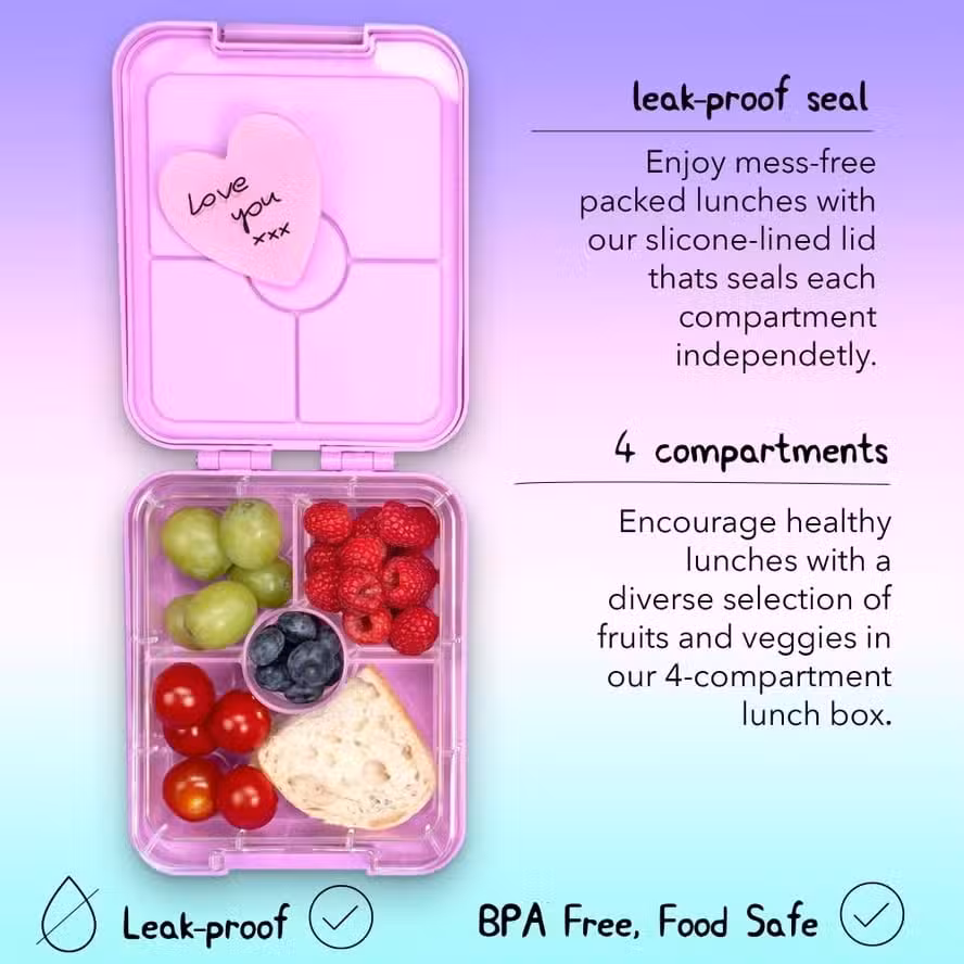Denne praktiske Fringoo Ruminddelt Madkasse Søde Dyr er den ideelle løsning til dig, der ønsker en lækagesikker og bekvem måde at opbevare din mad på farten. Med sine fire forseglede rum kan du nemt tilpasse dine måltider og holde hovedretter, sider, snacks og desserter adskilt uden besvær. Du kan også tage hele indsatsen ud, sådan du har ét stort rum i madkassen. Fringoo Ruminddelt Madkasse Søde Dyr lukkes med en kliklås, der sørger for den ikke åbner sig i tasken.