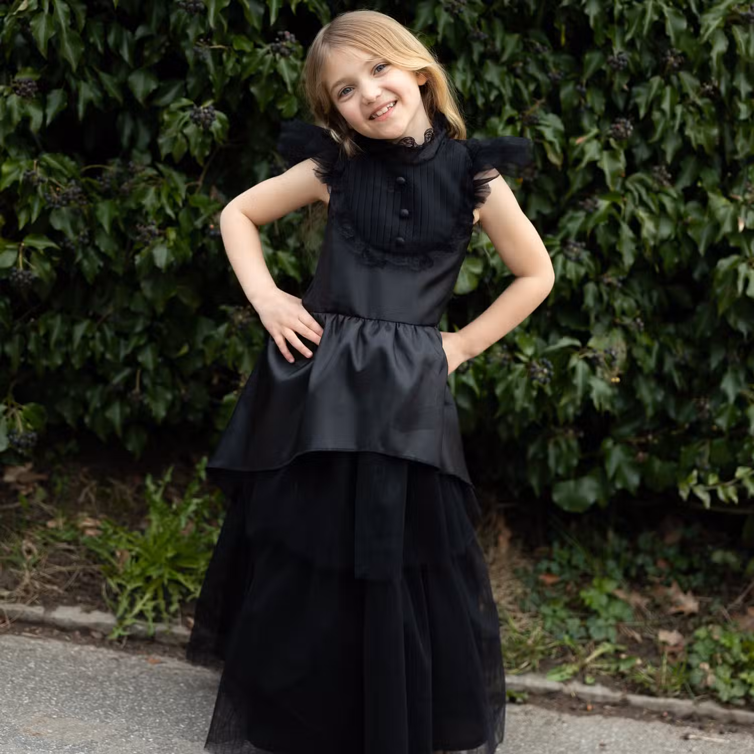 Kjolens overdel er dekoreret med fine detaljer og små plisseringer, mens skørtet falder i flere lag og giver fylde og bevægelse. De gennemsigtige tylærmer med vinger på skuldrene fuldender det gotiske look. Stoffet er let og behageligt, så barnet kan bevæge sig frit. Den lukkes i nakken, hvilket gør den nem at tage af og på uden hjælp.