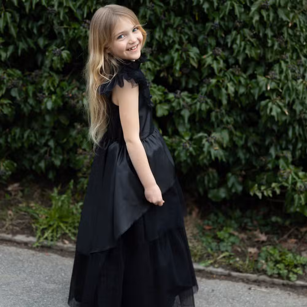 Great Pretenders gotisk kjole er en stemningsfuld og fantasifuld kjole, som passer perfekt til børn, der elsker rollespil, udklædning og magiske fortællinger. Kjolen er sort med flere lag tyl, der giver den et dramatisk og elegant udtryk.