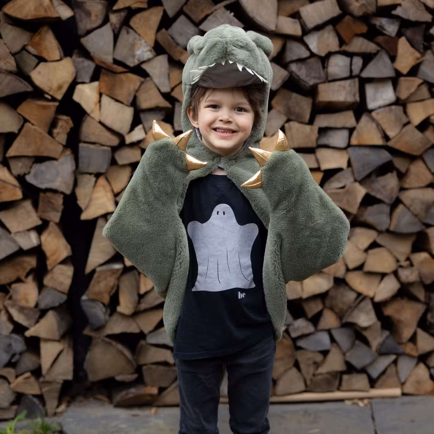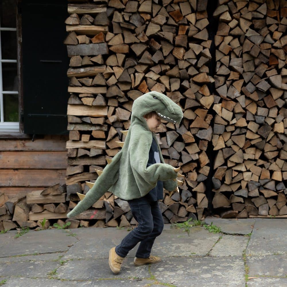Kappen er behagelig og let at have på. Den hænger løst og giver god bevægelsesfrihed, så barnet kan løbe, hoppe eller snige sig rundt som en ægte dinosaur. Materialet er blødt og rart mod huden, og designet er enkelt nok til, at barnet nemt kan tage kappen af og på selv. Kappen lukkes med velcro.