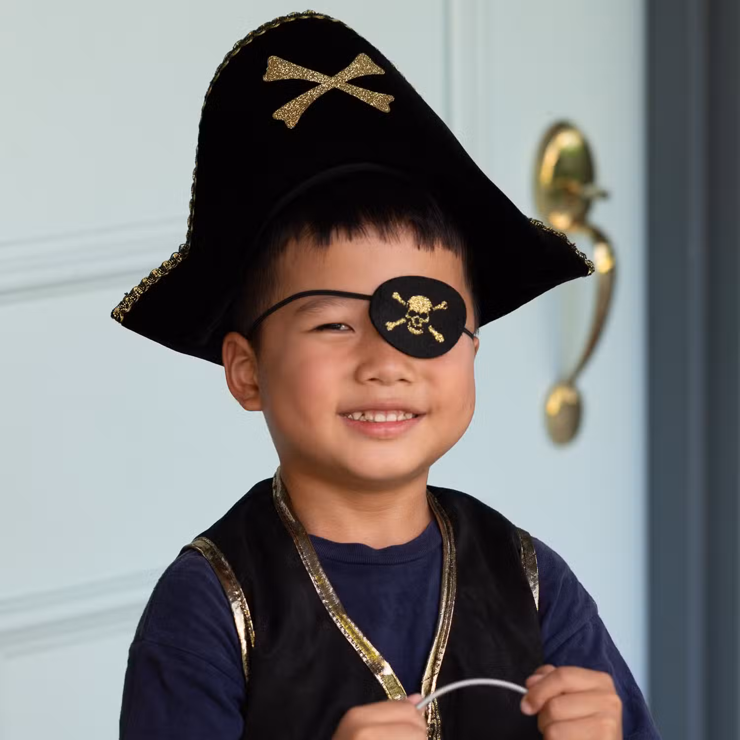 Argh.. spiltte mine bramsejl! Hvad er en kaptajn eller en pirat uden hans hat. Her får du en flot sort Great Pretenders Kaptajn Klo Hat lavet af skumvelour, der sidder godt fast på hovedet og er designet til en pirats vilde liv. Den er designet med flotte gulddetaljer og et flot guld emblem på fronten. Bliv top tunet og klar til at indtage dit skib, med denne seje udklædningshat. Brug den i hverdagens udklædningslege eller til dit pirat fastelavnskostume.