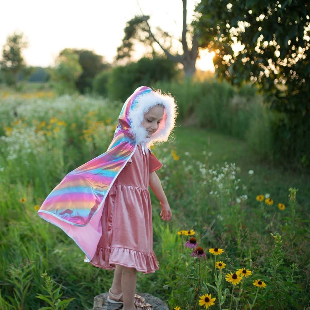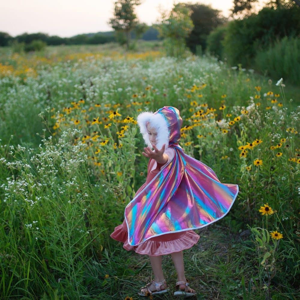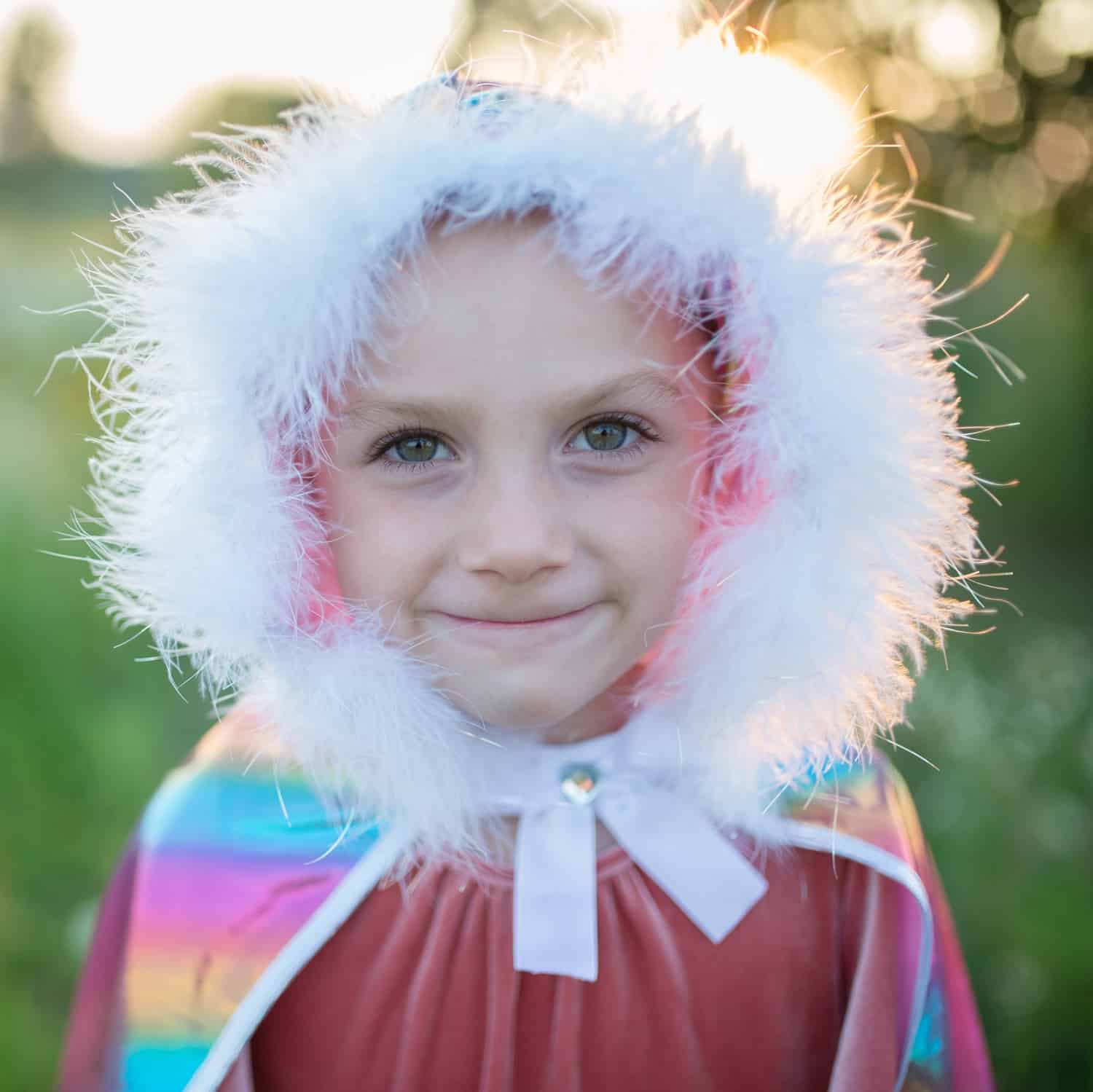 Denne regnbue prinsesse kappe fra Great Pretenders er fuld af elegance og yndighed. Kappen er lavet i en fin lyserød farve med multi farvede detaljer. Hætten er pænt draperet med en fin hvid blød kant, og kappen fastgøres med velcrolukning.