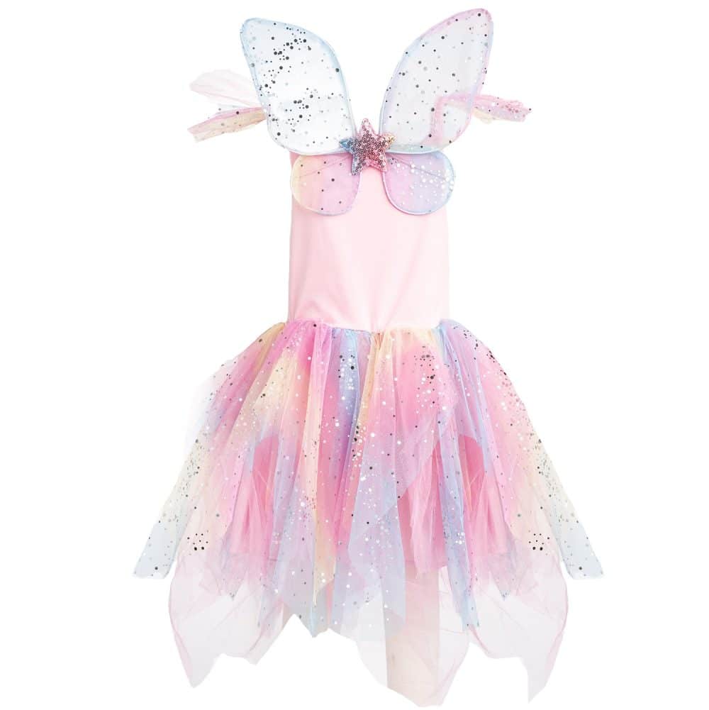 Se lige denne smukke og eventyrlige Great Pretenders regnbue fe kostume. Vi er helt vilde med den og med den kan du svære rundt i dine egne eventyr som en lille fe. Fe kjolen er med tylskørt i flere lag, hvor de inderste er pink og det yderste regnbuefarvet og med guld prikker. Toppen af kjolen er elastisk og er med smykke pailetter i regnbuens farver. På de to stropper er der flæser af regnbue tyl, som gør kjolen super yndig. For at sætte prikken over Iét på fe kostumet er der flotte matchende fe vinger med. De har elastikker, som du kan have på rundt om armene og suse afsted på bedste fe maner.