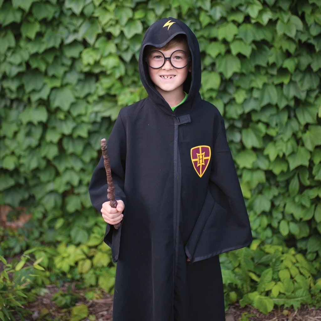 Abrakadabra – sig de magiske ord og tryl dig ind i troldmandens magiske univers! Dette seje Harry Potter inspirerede kostume er super cool og gennemført. Den Great Pretenders Troldmand Sort har en sort kappe med flotte vide ærmer. Den er i en lækker blød og glat kvalitet og har et satin kantbånd, der flot afslutter enderne. Den har en velcrolukning i halsen, så den er nem at tage af og på. På hætten og på brystet er der et troldmandsprint med et lyn og der medfølger sorte runde briller uden glas. Tryl din mor til en tusse eller din lillebror til en skildpadde, det er kun din fantasi der sætter grænserne, når troldmanden slipper sine magiske kræfter fri.