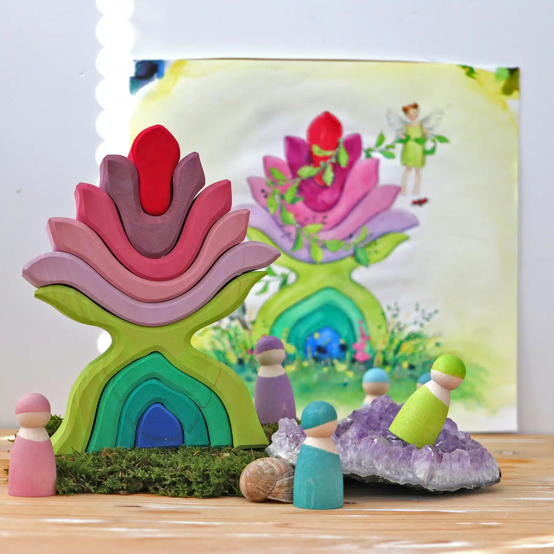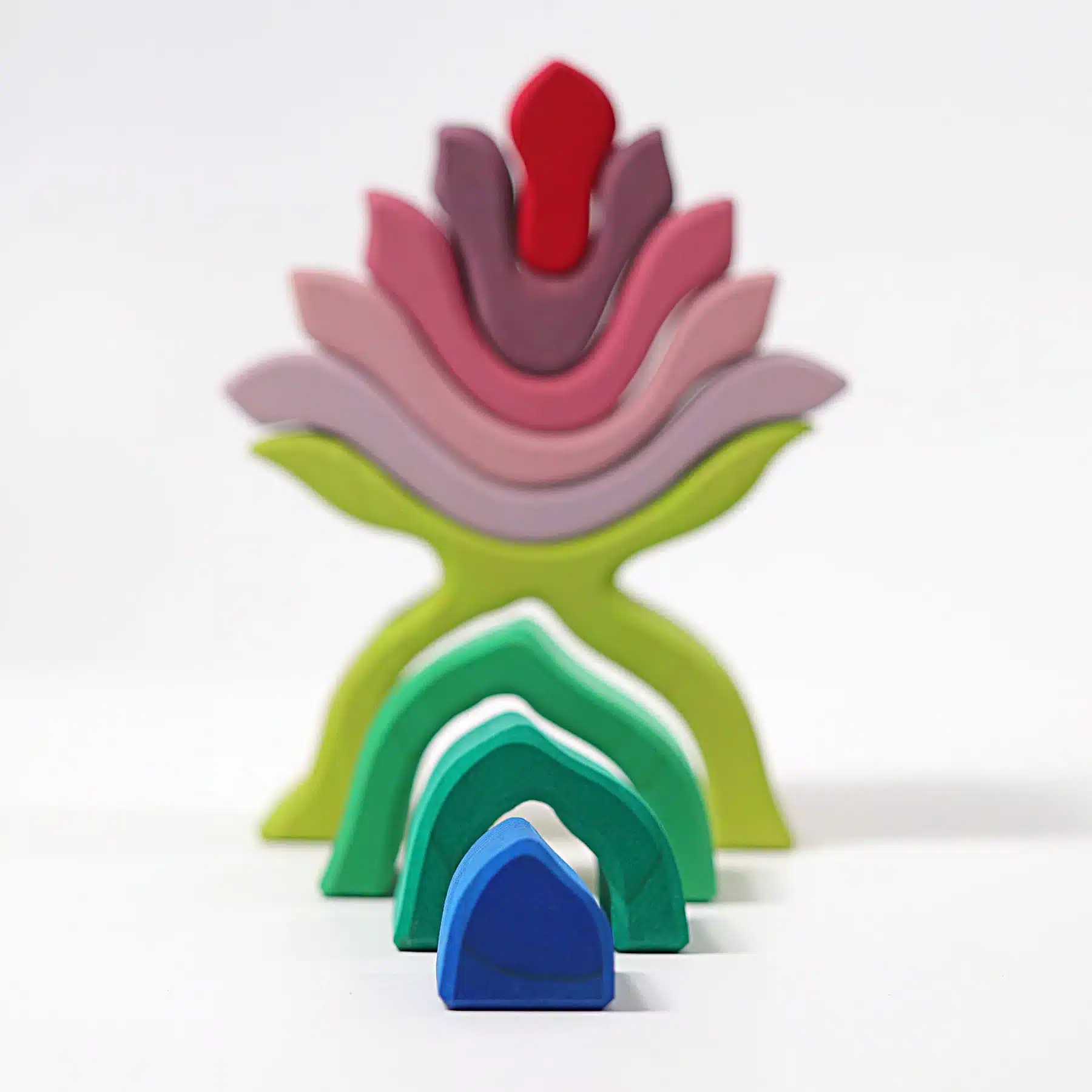 grimms stabeltårn blomst er meget mere end bare et stabeltårn. Det er en verden af muligheder. En dag er det en smuk blomst, en anden dag bliver det en feborg, en regnbue eller en fantasiskov. Legetøjet styrker barnets fantasi, finmotorik og evne til at tænke i former og balance.