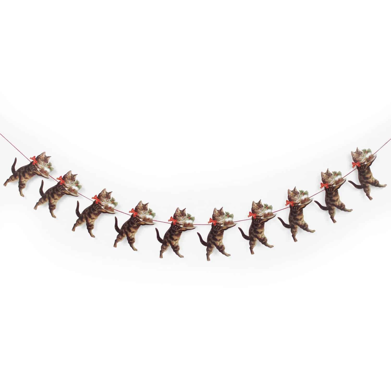 Guirlande Med Julekatte er en sjov og stemningsfuld juledekoration, som både børn og voksne vil elske. De ti charmerende katte motiver hænger side om side, hver især iført en rød sløjfe og med en lækker julekage mellem poterne. Det er svært ikke at smile, når man ser de søde katte strække sig op på tæerne og holde fast i snoren som en flok små nissehjælpere klar til julefest.
