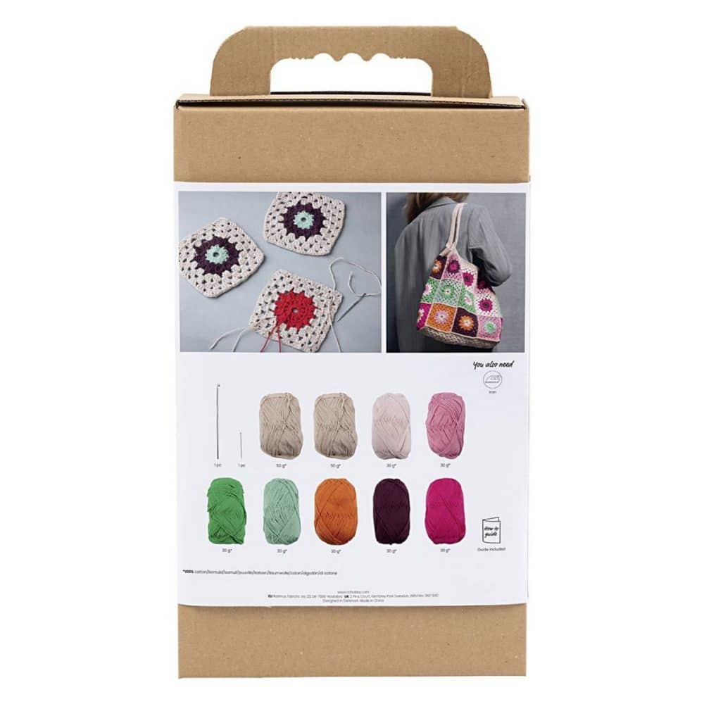 Med Hækle Kit Lav Din Egen Taske kan du fordybe dig i en kreativ proces, som du kan tage med dig overalt. Granny squares er nemme at lave og lige til at have med i tasken, så du kan hækle i toget, på caféen eller derhjemme i sofaen. Du skal hækle 27 firkanter, sætte dem sammen i rækker og afslutte med en pæn kant og hank. Når du er færdig, har du en helt unik og cool taske, som er både praktisk og hjemmelavet med kærlighed.