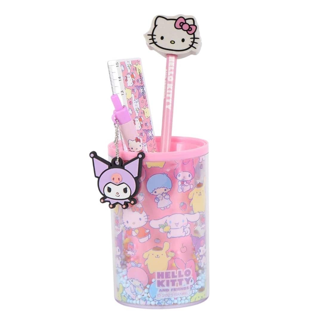 I sættet finder du en kuglepen, en lineal, en blyant med et stort viskelæder formet som Hello Kittys hoved samt en dekorativ kop. Den gennemsigtige kop er pyntet med masser af små figurer fra Hello Kittys verden, og der er endda et sødt Kuromi vedhæng på kuglepennen, der giver ekstra charme.