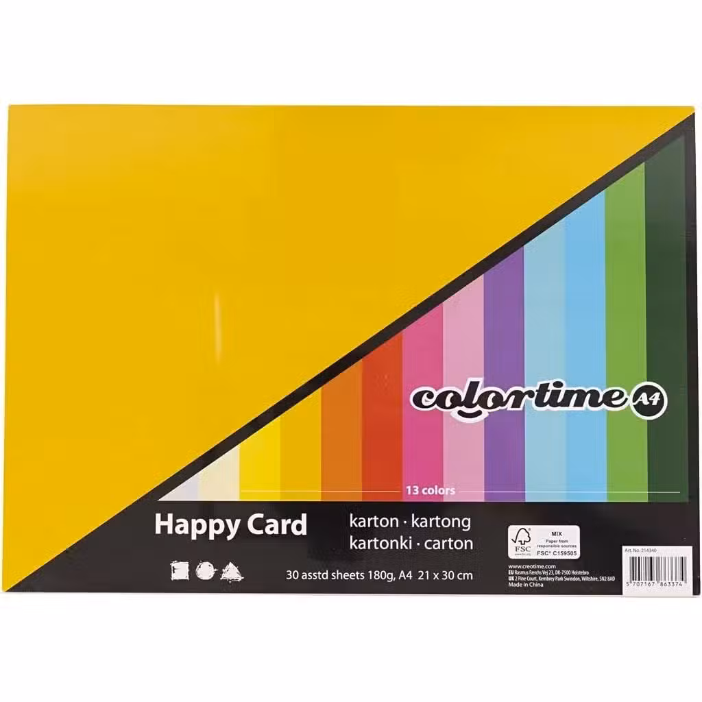 I Karton A4 Forårsfarver får du en pakke med 30 ark karton i forskellige farver. Det er kraftig miljøvenlig karton, som er gennemfarvet.