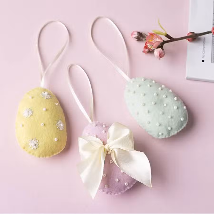 Påsken er en perfekt tid til kreative sysler, og dette sæt gør det nemt og sjovt at lave din egen påskepynt. Du syr først æggene sammen med det medfølgende broderigarn og dekorerer dem med små detaljer som rocaiperler og silkebånd. Når de er fyldt med det bløde bamsefyld, får de en flot, fyldig form, der passer perfekt til ophæng.