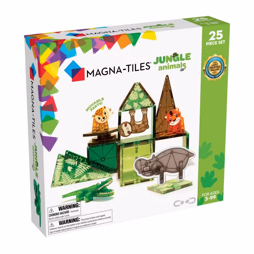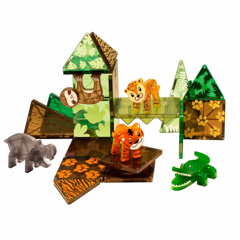 Magna Tiles Jungledyr 25 Stk inviterer dit barn på en eventyrlig rejse ind i junglens dybe grønne landskab. Med dette sæt kan børnene bygge hytter, trætoppe og gemmesteder til de sjove jungledyr, der følger med. Blandt andet en tiger, en krokodille, en dovendyr og en nysgerrig flodhest. De magnetiske brikker i grønne og brune nuancer har flotte prints af blade og dyrepoter, så det virkelig føles som at være midt i junglen.