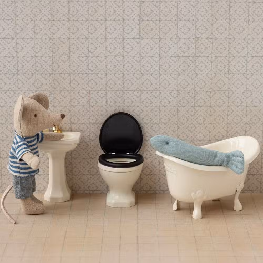 Maileg WC Råhvid Mus er skabt i en solid og charmerende stil. Det gør rollelegen både sjov og realistisk. Måske skal en lille mus op midt om natten. Eller måske vasker den hænder efter en lang dag i haven. Her kan børn lege dagligdag og skabe små historier, som de kender fra deres egen verden. Detaljerne i designet giver liv til fantasien, og den fine størrelse gør det let at flytte rundt på i huset.