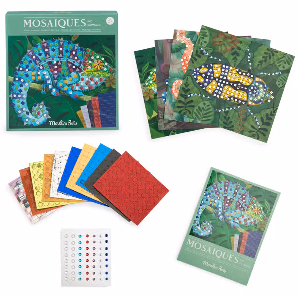 Moulin Roty mosaik dyremotiver er en kreativ aktivitet, hvor børn kan dekorere farverige dyrebilleder med små selvklæbende mosaikfliser. Sættet indeholder 5 illustrerede kort med forskellige motiver, 10 ark mosaikklistermærker i klare farver og 1 ark med glitrende perler, som giver det færdige resultat et ekstra flot udtryk.