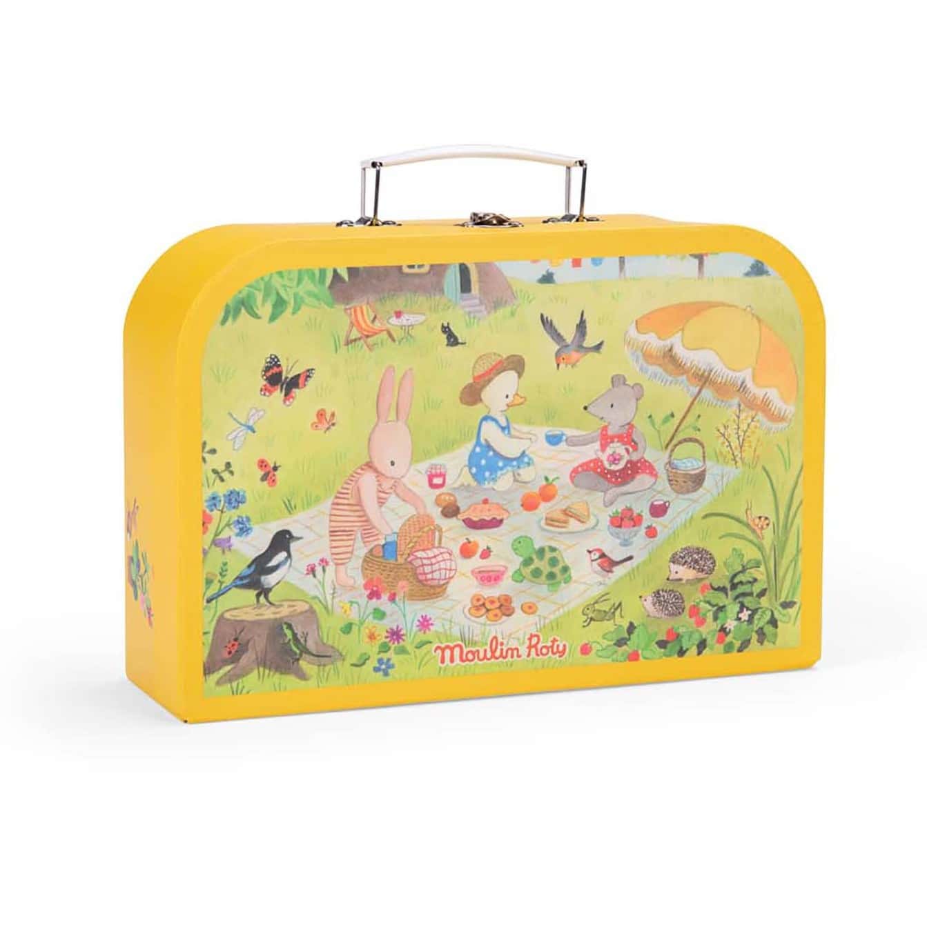 Moulin Roty testel i kuffert la familie er et yndigt og fantasifuldt testel børn vil elske at invitere til teselskab med. Hele sættet kommer i en smuk gul kuffert med et poetisk skovtema illustreret af Camille Jourdy. Her mødes dyrevenner til picnic i det grønne – en scene, som straks sætter gang i barnets fantasi og rolleleg. Inde i kufferten gemmer sig et farverigt testel i metal med alt, hvad små værter skal bruge til at servere te for bamser, dukker eller bedstevenner.
