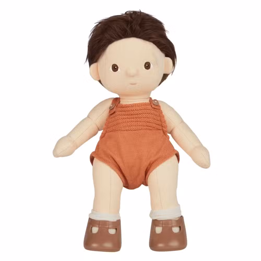 Denne fine Olli Ella Dinkum Dukke Peanut er super søde og den er lavet i 100% bomuld. Dukken har mørkt kort hår og brune øjne. Søde lille Peanut har en flot strikket buksedragt på. Når Dinkum dukken har sine fine sko på, kan den selv stå op.