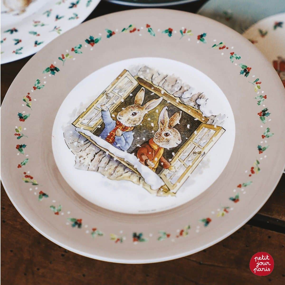 Peter Kanin Tallerken Jul Beige er en hyggelig og stemningsfuld juletallerken, som bringer varme og glæde til decembermåltiderne. I midten kigger to små kaniner ud af et åbent vindue, mens sneen daler stille ned udenfor. De er pakket ind i lune halstørklæder og ligner nogen, der venter spændt på juleaften. Langs kanten af tallerkenen snor små kristtjørnblade sig og giver et klassisk og fint juleudtryk.