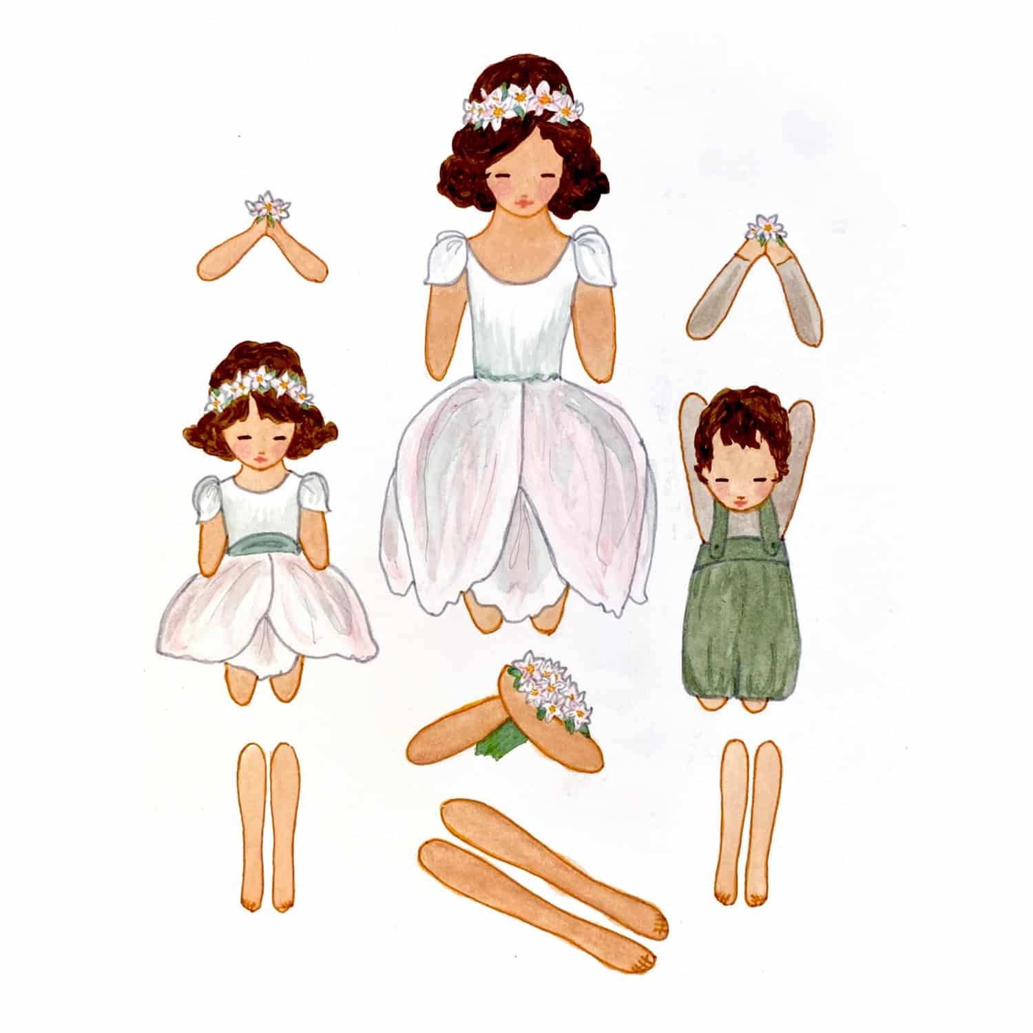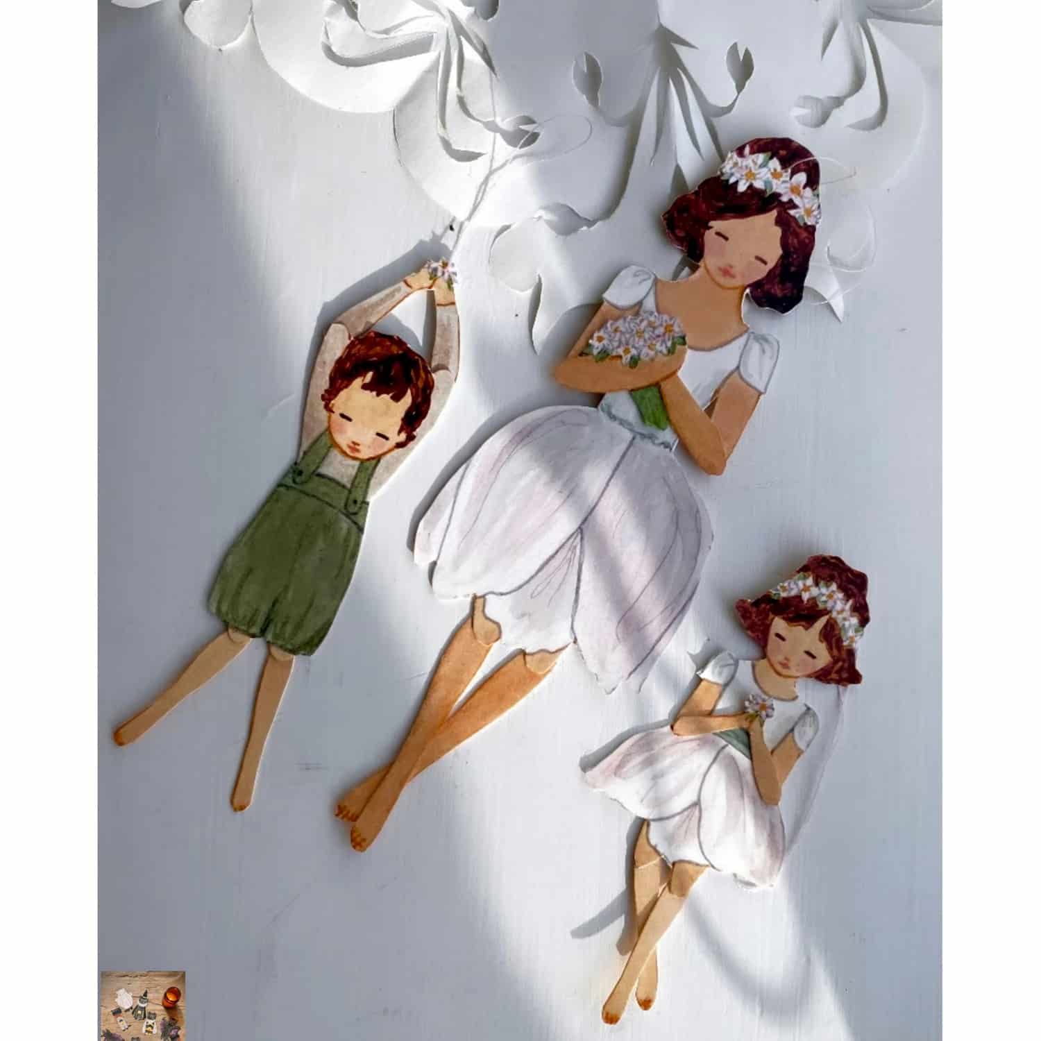 Tall Hat Tales Anemonefamilie er et poetisk og stemningsfuldt papirklip, hvor du får en mor med blomsterkrans og to søde børn klar til at blive klippet ud og hængt op som pynt. De fine figurer er trykt på kraftigt papir og har motiver på begge sider, så de ser flotte ud uanset hvor man kigger fra. Det gør dem perfekte til at hænge i vinduet, på døren, under en hylde eller måske på en gren fra haven.