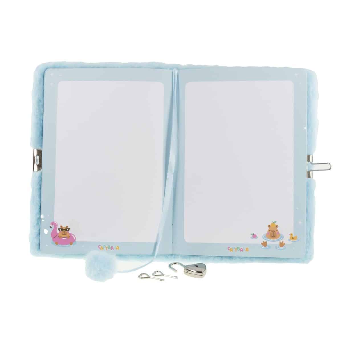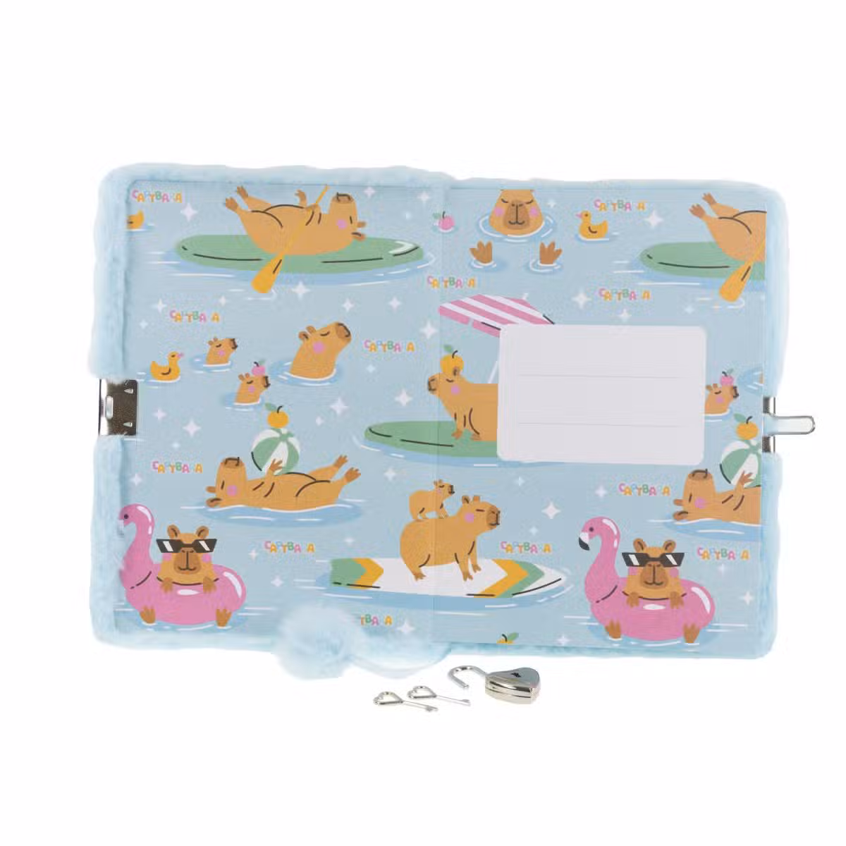 Tinka dagbog med lås capybara er den perfekte hemmelighedsbog for små dyreelskere. Den bløde og fluffy forside i himmelblå plys er prydet med en nuttet capybara og et lille pink hjerte.