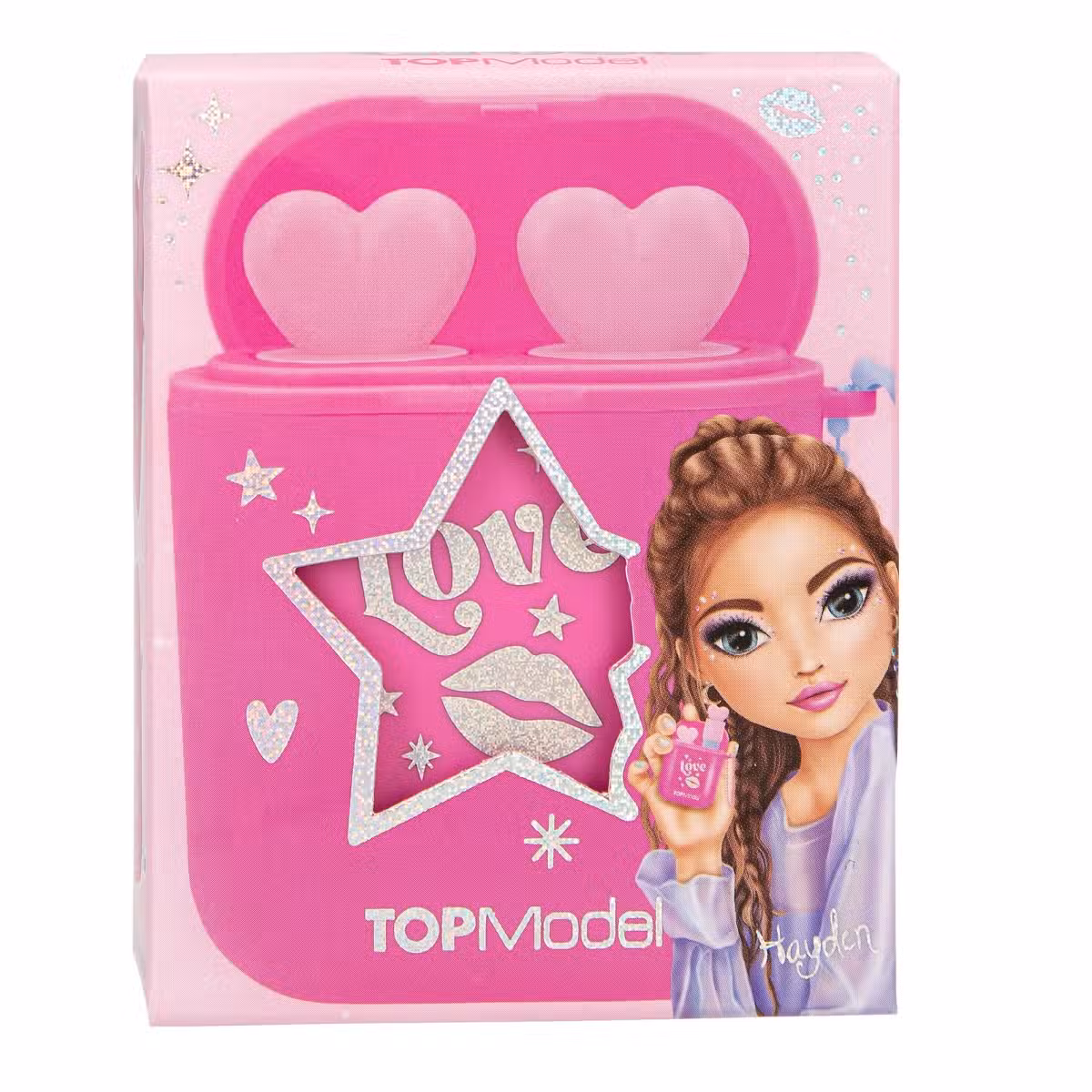 Top Model lipgloss headphone er en super sej og anderledes måde at tage lipgloss med på farten. De to små hjerteformede lipgloss ligger gemt i en æske, der ligner et par trådløse høretelefoner. Men i virkeligheden gemmer på skinnende læbepleje med duft af frugtige lækkerier. Den lyserøde gloss dufter af blåbær, mens den røde byder på en sød jordbærduft.